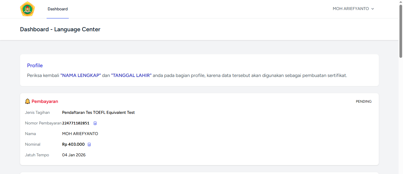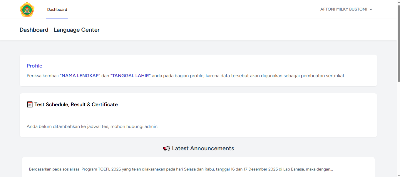 Jadwal Test Toefl atau test lainnya dapat dipantau melalui website pusat-bahasa dengan cara login ke dashboard.