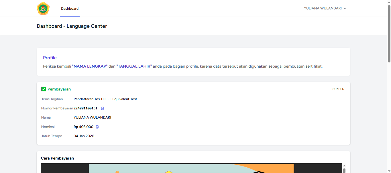 Setelah melakukan pembayaran atau status pembayaran telah sukses, selanjutnya tinggal menunggu jadwal test.