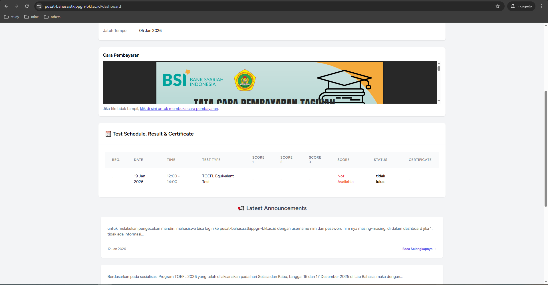 3. Pada halaman dashboard, scroll kebawah hingga Anda menemukan informasi mengenai jadwal, skor test, dan sertifikat