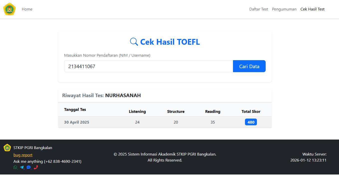 Hasil test dapat dilihat paling cepat pada hari Anda test pada pukul 16.00 WIB. Untuk melihat hasil test, Anda tidak perlu login, cukup mengakses halaman pusat-bahasa.stkippgri-bkl.ac.id, scroll kebawah hingga Anda menemukan bagian "Cek Hasil Test"